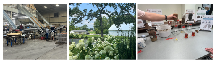 The next morning, we visited the Kornegay Family Farm, where we learned about the commercial production of sweetpotatoes. I found it fascinating how nothing goes to waste—while perfect sweetpotatoes are packaged for sale, larger or blemished ones are pureed, canned, or turned into fries. I also learned that sweetpotato should be spelled as one word (to distinguish it from regular potatoes, which are a different plant species). Later, at Brooke’s Fresh Cut Flower Farm, we saw how horticulture intersects with business and aesthetics: her farm primarily grows flowers for weddings and offers flower subscription services. In the afternoon, we rotated through five stations focused on vegetable production,