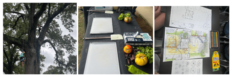 Thursday began at the Lake Wheeler Research Field Labs, where arborists from Bartlett Tree Experts demonstrated tree climbing and discussed their work in arboriculture. Then, we all put on harnesses and climbed a massive tree to experience how they work with their own trees. Afterwards, we made fresh pico de gallo at the Agroecology Farm using freshly picked tomatoes, basil, garlic, and other ingredients. In the afternoon, we visited Greenview Landscape Design, where we learned how landscape architects create functional yet beautiful spaces. My group designed a pollinator-friendly garden, incorporating native plants to attract bees and butterflies. Our final evening activity was unfortunately rained out, so we got some extra downtime to spend with our campmates during our final night at NC State.