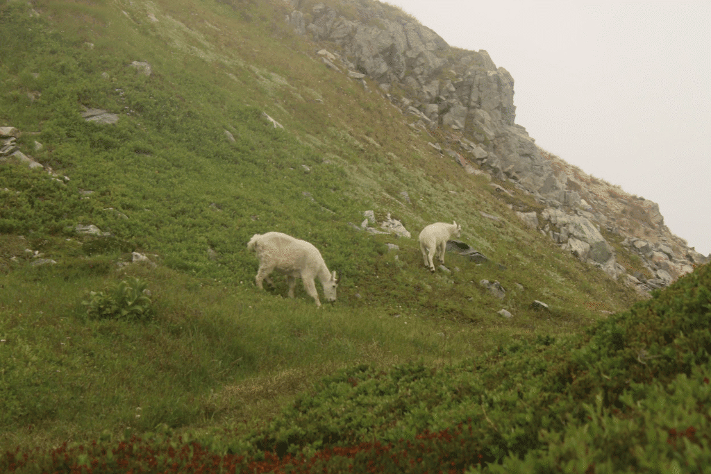 The fourth day marked our final push to Sahale Glacier Camp, which lays at the base of Boston Peak and Sahale Glacier. The last two miles of this day exhibited an ecosystem unlike anything I had ever seen. We were completely above treeline, but there was still plenty of vegetation such as moss, shrubs, and small berries that thrived in the wet climate. The hike up to Sahale Glacier was filled with sightings of mountain goats, which park rangers describe as “ecosystem engineers.” The goats are known to lick and expose mineral-rich rocks so other species can use them. Though non-native, the goats play a vital role by redistributing minerals and nutrients across alpine terrain.