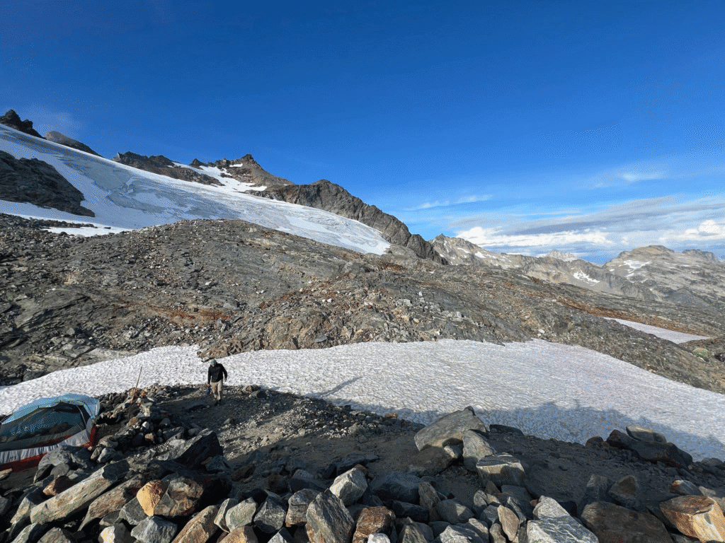 As we neared our campsite, the ground level vegetation slowly disappeared and gave away to rock and fields. We camped at roughly 8,000 feet of elevation, beside the glacier that feeds into the same Stehekin River we followed earlier. Besides being the source of the river itself, the glacier is important for the river valley ecosystem as it regulates water temperature, providing a safe habitat downriver species. However, the glacier has lost 25% of its volume in the last twenty years, a clear warning of the consequences of climate change.