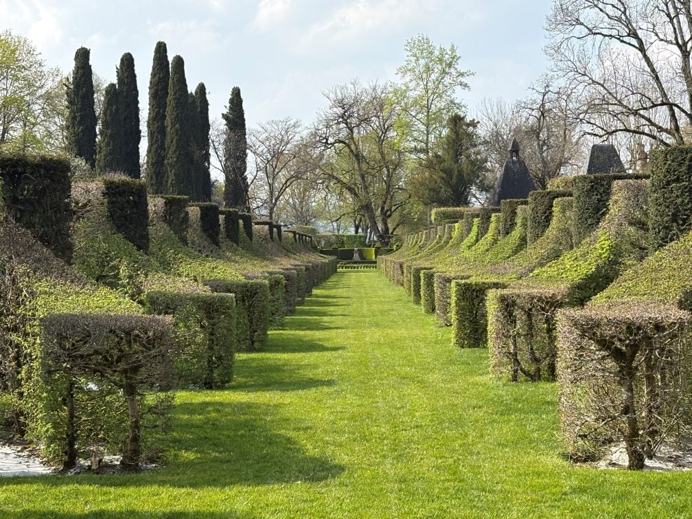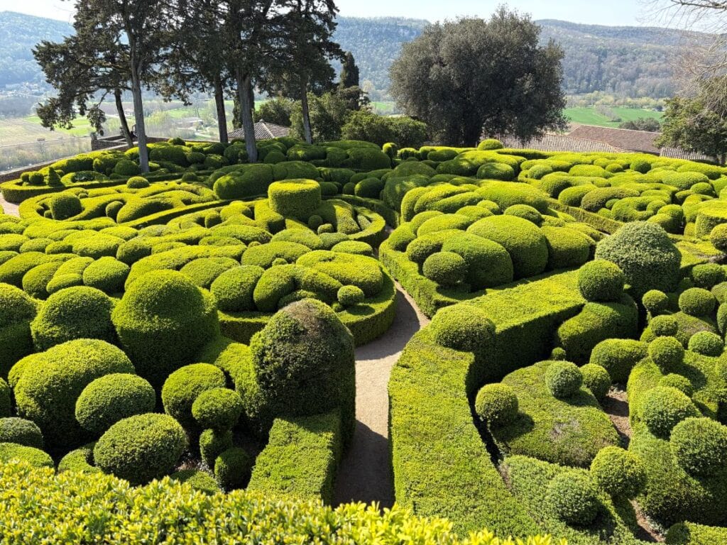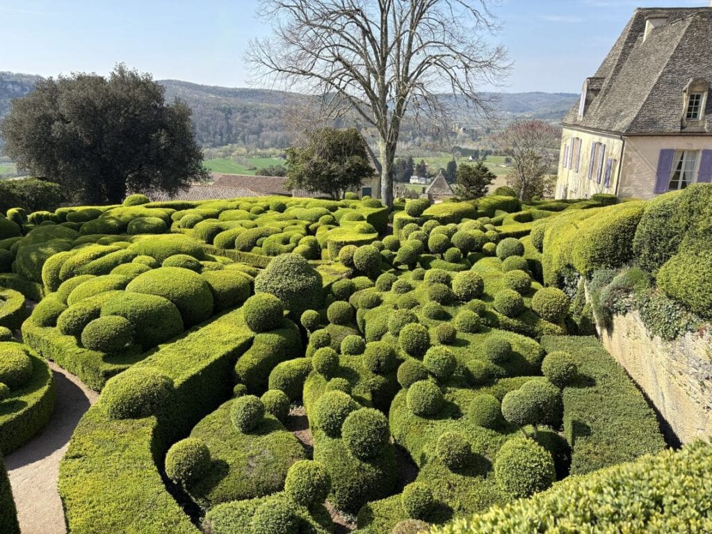 Les Jardins de Marqueyssac, suspended 420 feet above the Dordogne river near La Roque Gageac, is jaw-dropping. Hand-pruned into interlocking spheres and cubes, their boxwoods are stunning as you began a 35-minute walk from the panoramic view at the entrance through an Allee, a Rotonde, an Esplanade, and Cascades to the Belvedere, a Michelin-starred viewpoint atop the cliffs.