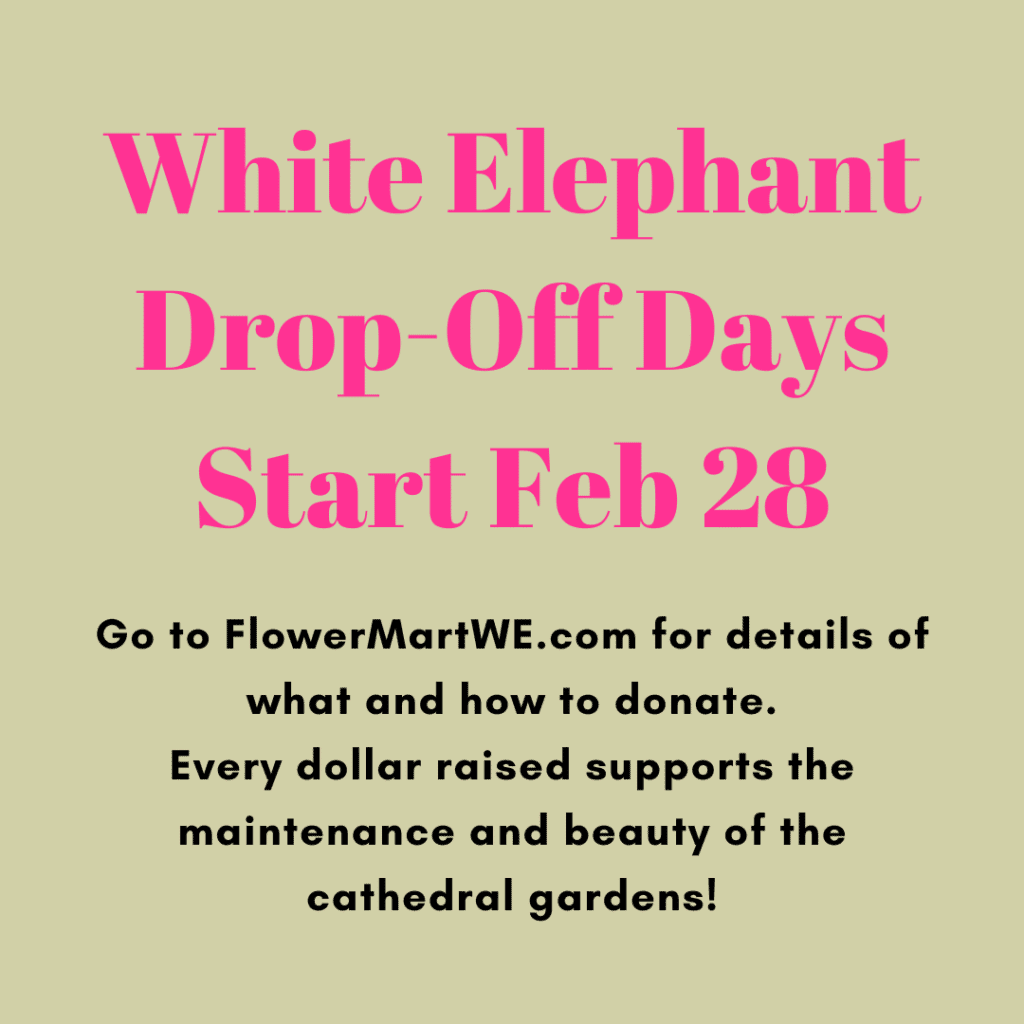 If you are downsizing or decluttering your home, the Flower Mart White Elephant Committee will happily take your stuff. Our donation drive begins Saturday, February 28, and runs each Saturday through April 11, except Easter weekend. Saturday donation drop-off dates are 2/28, 3/7, 3/14, 3/21, 3/28, 4/11. You can drop off donations between 10 am and 2 pm at the Cathedral Library on South Road, directly behind the National Cathedral. This is the same location as last year. Signs posted along South Road will direct you to the the library. Volunteers will be on hand to help unload cars. Donation receipts are available upon request. Parking is also available along South Road near the library.